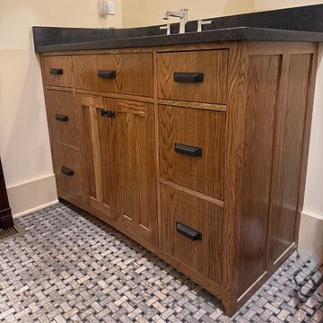 Craftsman style inset vanity with continuous grain matched drawer fronts. Finished off with bronze hardware and dovetail drawer boxes. All cabinetry is made with soft close doors and under mount soft close drawer slides.